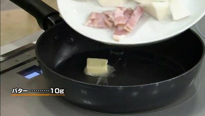 2.鍋にバターを入れ、ベーコンとカブを炒める。