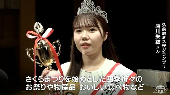 「弘前城ミス桜」グランプリは黒石市の団体職員「夢のような感じでとてもうれしかった」 青森県弘前市 2025年4月6日(日) 18:13 国内 「弘前城ミス桜コンテスト」が6日行われ、青森県黒石市の女性がグランプリに選ばれました。 コンテストの決勝審査には1次審査を通過した7人が出場し、それぞれが自己PRとともに、弘前市の魅力などを発表しました…