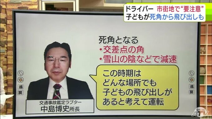 中島さんによりますと、交差点の角や、雪山の陰などは特に注意してスピードを落とすことが必要だとしています。