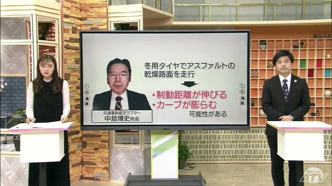 また、冬用タイヤを交換していない人もいるかと思いますが、冬用タイヤでアスファルトの乾燥路面を走るとブレーキをかけても制動距離が伸びたり、カーブが膨らんだりする可能性があるということで、注意が十分必要だと話しています。
