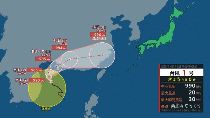 【台風情報】「台風1号(ウーティップ)」の今後の動向は… 最大瞬間風速30m/s ・西北西にゆっくり北上中 16日には「熱帯低気圧」になるか【最新進路予想図・5日先までの雨と風の予想シミュレーションあり】(12日午後3時20分現在) 2025年6月12日(木) 15:20 国内 最新の進路予想図