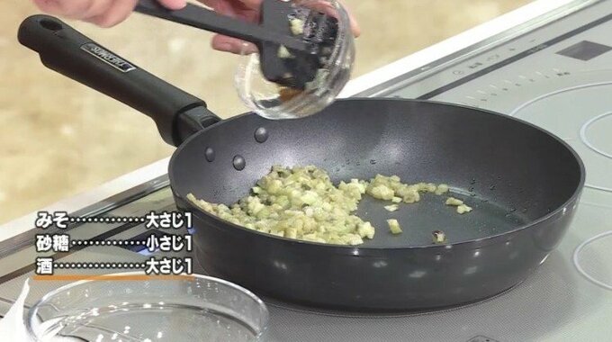 3.フライパンにごま油を引き、なすと調味料を入れ水分がなくなるまで炒める。