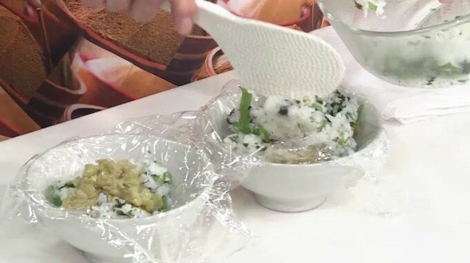 5.4のご飯を2等分し、なす味噌を中に入れおにぎりにして完成!