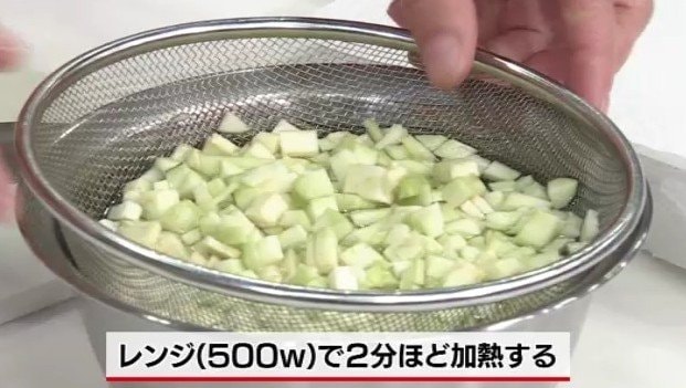 1.なすは皮を剥いて5mm角に切り、水にさらしてザルにあけ軽く水気を絞る。2.1のなすをレンジ(500w)で2分ほど加熱する。