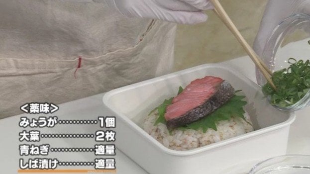 3.薬味のみょうがと大葉を千切り、青ねぎを小口切りにし、お弁当箱の隙間に詰める。