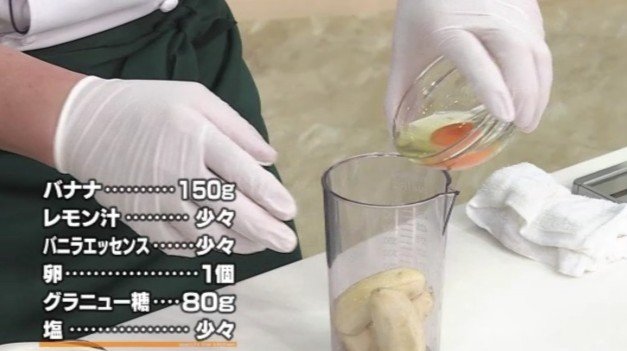 2.ハンドブレンダー(またはミキサー)にバナナ・レモン汁・バニラエッセンス・卵・グラニュー糖・塩を入れよくミキシングする。