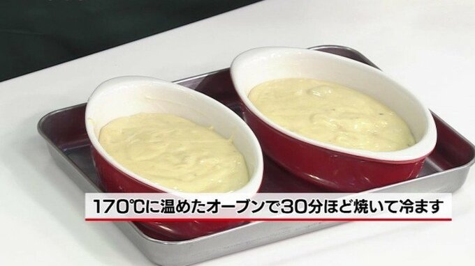 6.1のグラタン皿に4の生地を流し入れ、170℃のオーブンで30分ほど焼いて冷ます。