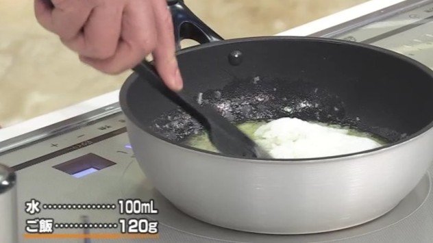 4.水とご飯を加え混ぜながら煮る。