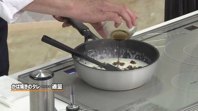 6.程よいとろみ具合になったら、刻んだうなぎとかば焼きのタレを加え塩・黒こしょうで味を調える。