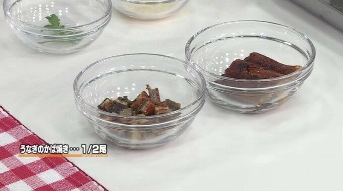 1.うなぎはレンジ加熱して温め、飾り用を少し取り分け残りを刻む。