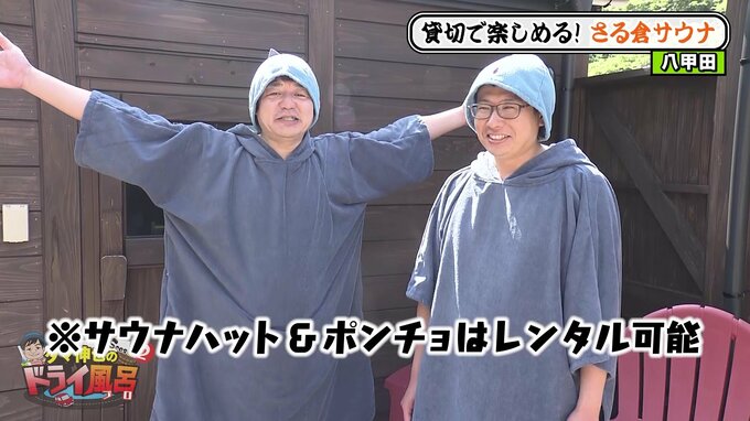【さる倉サウナ】は、水風呂と休憩部屋も完備。レンタルできるということで、ポンチョとサウナハットを身に付けて早速サウナへ。