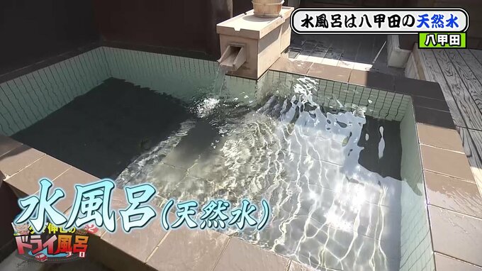 『水風呂』は、八甲田の天然水を贅沢にかけ流しています。貸切なので、頭まで浸かって体を冷やすこともでき、タマさんは実践していました。