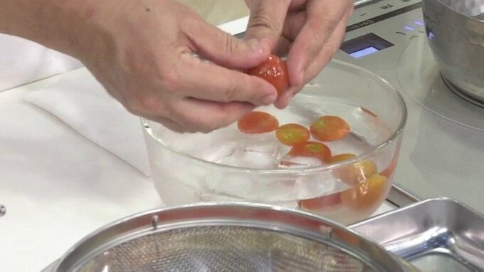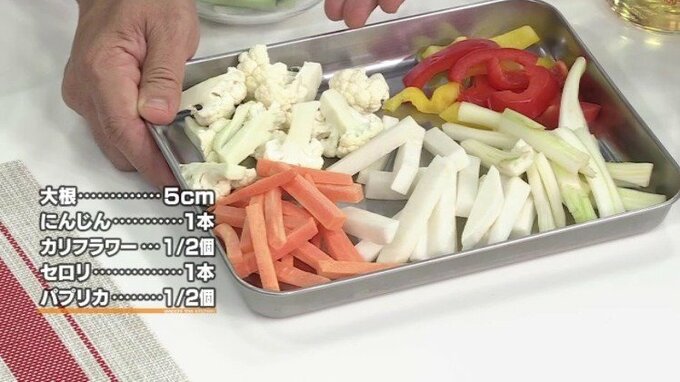 2.大根とにんじん・カリフラワー・パプリカを沸騰したお湯でさっとゆでて冷ます。ミニトマトは切れ目を入れて湯むきする。
