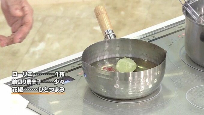 3.水・砂糖・塩を鍋に入れ火にかけ、ひと煮立ちしたら酢を加えて火を止め、ローリエ・輪切り唐辛子・花椒を入れる。