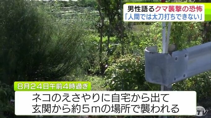 弘前市大和沢に住む村田光春さん(76)は8月24日の朝、えさをあげるために自宅から出てネコを探していたところ、玄関から5mほどの場所でクマに襲われました。
