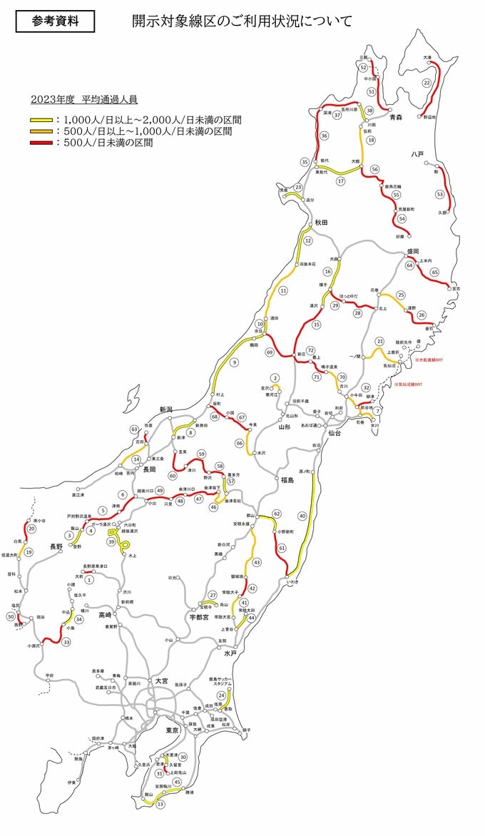 ATVの注目記事まとめ! 【一覧あり】27億円超の赤字の区画も… JR東日本が「ご利用の少ない線区の経営情報(2024年度分)」を発表 100円稼ぐための『営業係数』が1万円超の区画も… あなたの街のあの路線・区画も…? 2025年10月27日(月) 16:05 国内 【過去のデータは?③】 開示対象線区のご利用状況について【2023年度】 (東日本旅客鉄道株式会社の参考資料より)