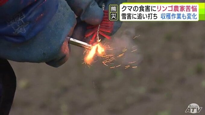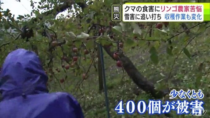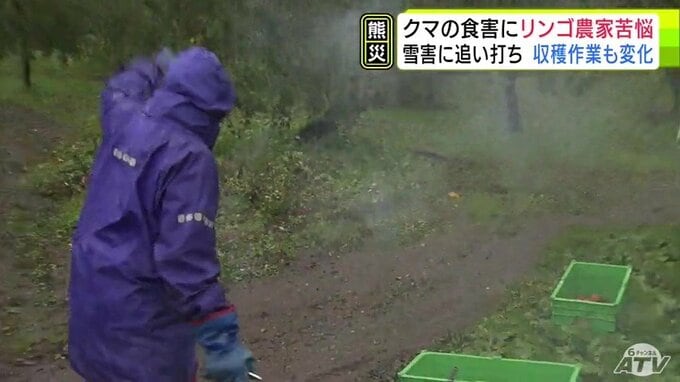 作業前には爆竹や花火を使ってクマを園地に近づけないようにしていますが、少なくとも400個のリンゴが食い荒らされていました。