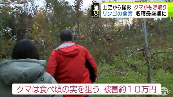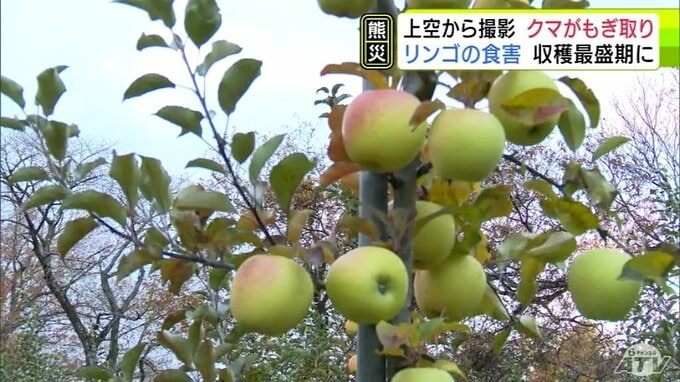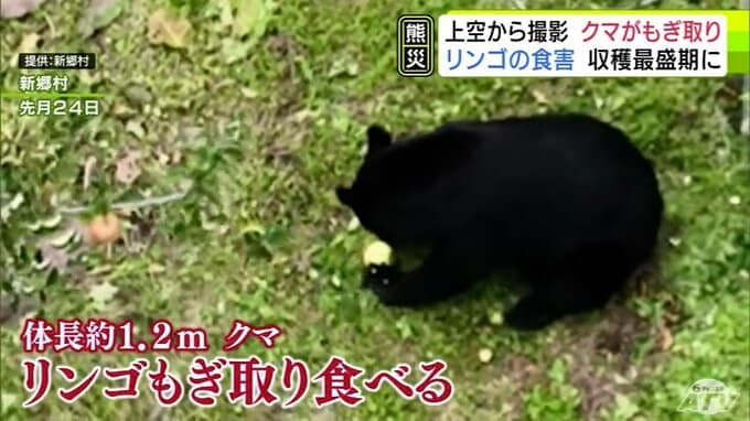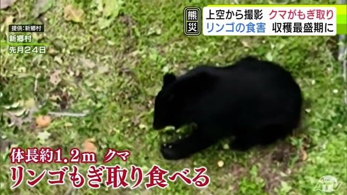 10月24日、クマの被害が懸念されたため、猟友会が新郷村のリンゴ畑にドローンを飛ばしたところ、体長約1m20cmのクマがリンゴをもぎ取り、食べている様子が捉えられていました。