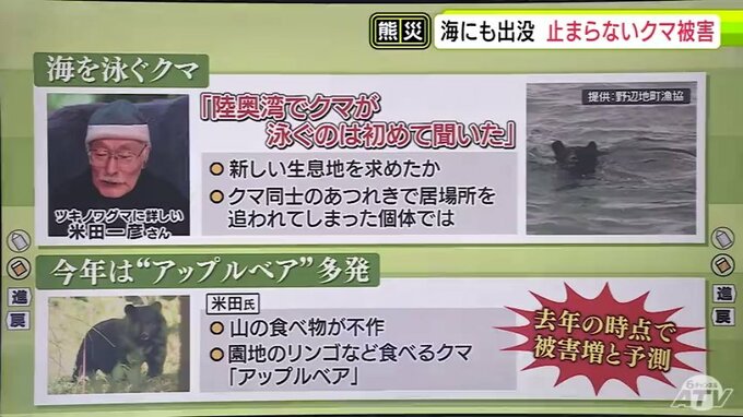 ATVの注目記事まとめ! 「これ以上、食わないでくれ…」クマが自らリンゴをもぎ取り・食べる 食害で農家から悲鳴 収穫最盛期なのに恐怖で畑になかなか行けない現状「悔しい思いでいっぱい」「クマもわかっているんじゃ…」【熊災】 2025年11月20日(木) 21:50 国内 なぜ「陸奥湾」にクマが? 「新しい生息地」を求めた可能性も… 米田さんは、陸奥湾にあらわれたクマについて、 ①「新しい生息地を求めて泳いできた」か②「クマ同士のあつれきで居場所を追われてしまった個体ではないか」と推測しています。