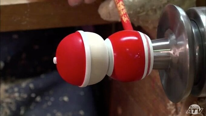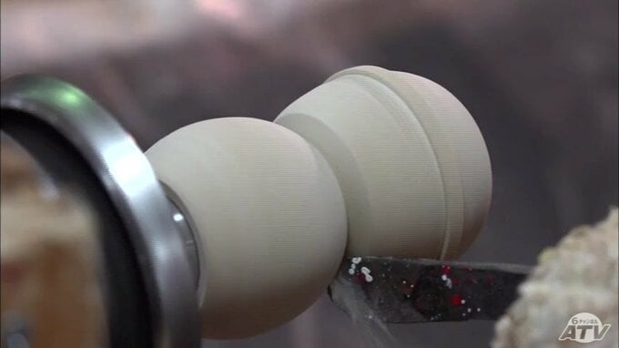 13日は、阿保正文さんがイタヤカエデの木をろくろに取り付け、三角の帽子に丸い顔と体のサンタクロースをかんなで削り出していきます。