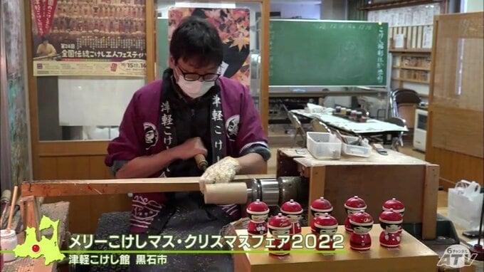 11月下旬に始まった津軽こけし館の「メリーこけしマス・クリスマスフェア2022」では、先週からこけし工人が「サンタこけし」を製作しています。