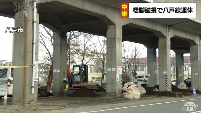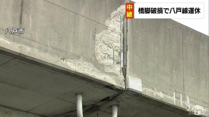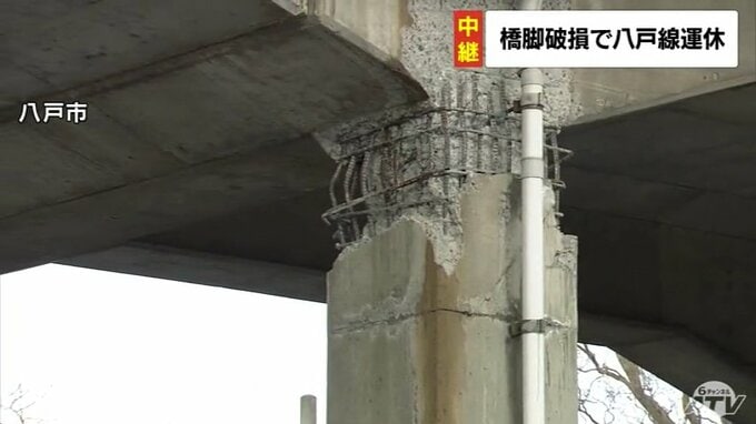 「JR八戸線本八戸駅〜小中野駅間の高架橋前です。地震の影響で橋脚の上部のコンクリートが剥がれ落ち、鉄筋がむき出しの状態になっています。欄干の部分も破損しています。現在、JRの職員などが調査作業を行っていますが、現時点で被害箇所は20か所に及ぶということです。この影響でJR八戸線は八戸駅~久慈駅の間で運転を見合わせとなっていて、再開の目途はたっていません」