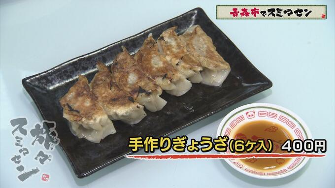 にんにくの風味がきいた【手作りぎょうざ】(6ケ入・400円)にも舌鼓。川口さん、一口食べるなりOKサイン!