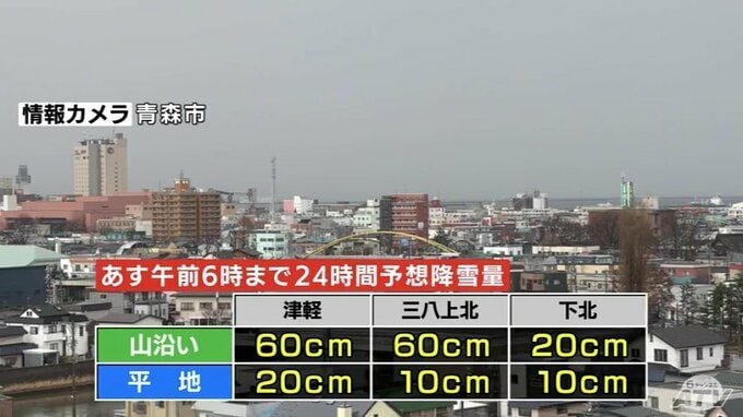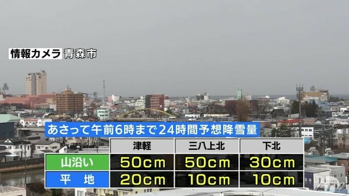 さらに、明後日13日午前6時までに降る雪の量は津軽と三八上北の山沿いが50cm、下北の山沿いが30cm、津軽の平地が20cmなどとなっています。