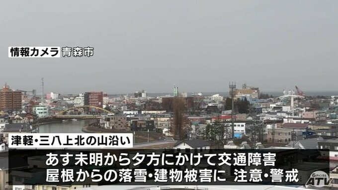 津軽と三八上北の山沿いでは、12日未明~夕方にかけて大雪による交通障害、屋根からの落雪、建物への被害などに注意・警戒してください。