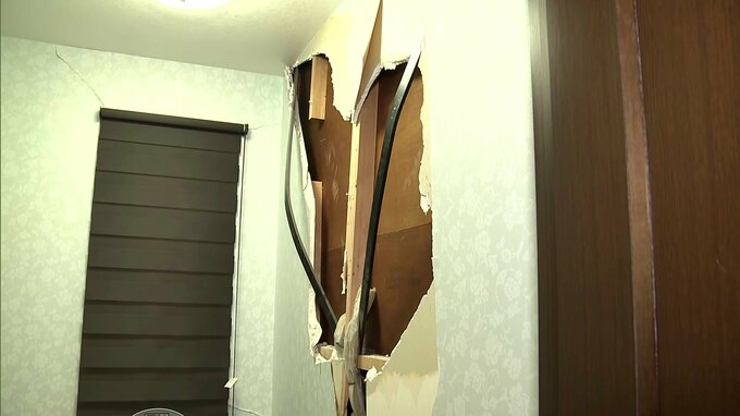 地震直後はたどり着くことも困難だったというトイレ。ここの壁も大きく裂けてしまっています。今でも、壊れるのではないかと不安があり、自宅のトイレは怖いと話します。