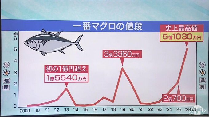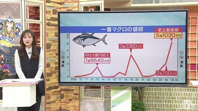 2009年~2026年までの17年間のうち、2011年以外は大間産のマグロが“一番マグロ”となっています。金額を見ると、2013年に初めて1億円を超え、2019年には3億円を超えて当時の最高値となりました。