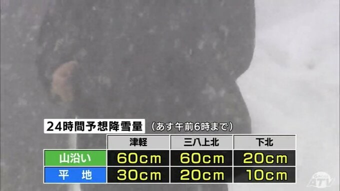 9日午前6時までの24時間に予想される降雪量は、山沿いは津軽と三八上北が60cm、平地は津軽が30cm、三八上北が20cmなどとなっています。