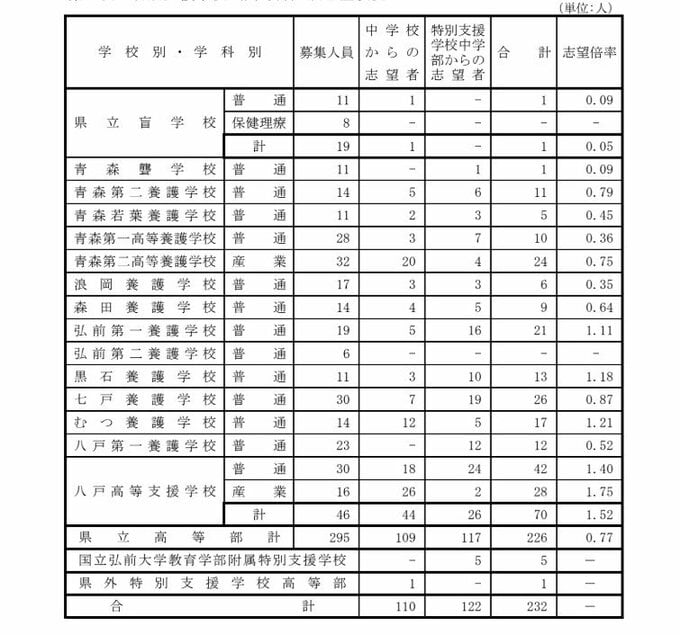 ATVの注目記事まとめ! 青森県立高校入試2026 志望倍率 青森高校1.25倍、弘前高校1.26倍、八戸高校1.22倍など 最も高いのは弘前実業1.50倍 全日制0.92倍【全校掲載・学校別倍率一覧】(進路志望状況 第2次調査結果) 2026年1月8日(木) 17:00 国内 ♦記事を最初から読む