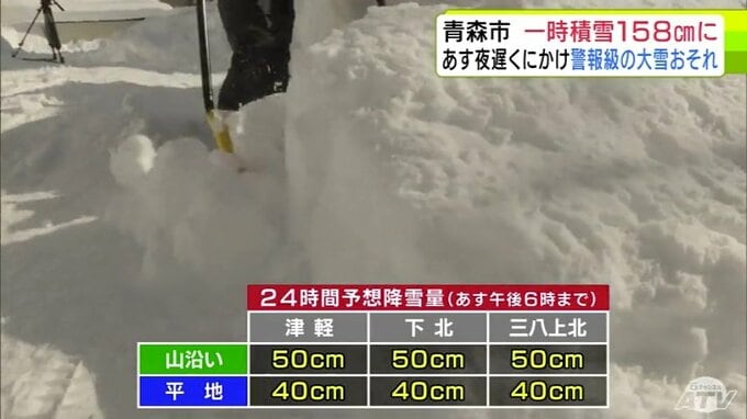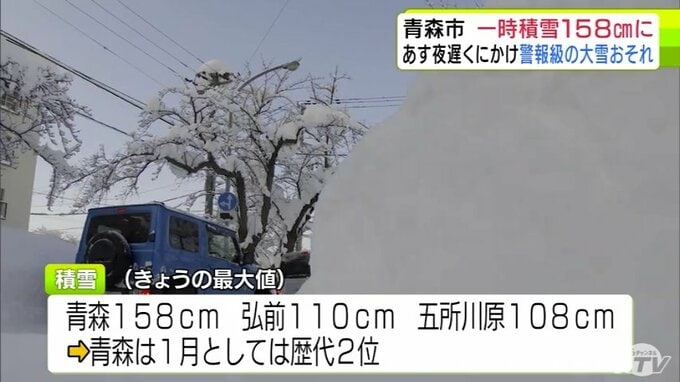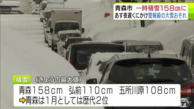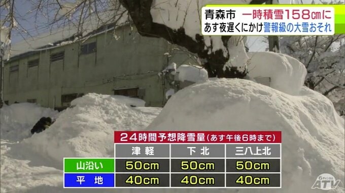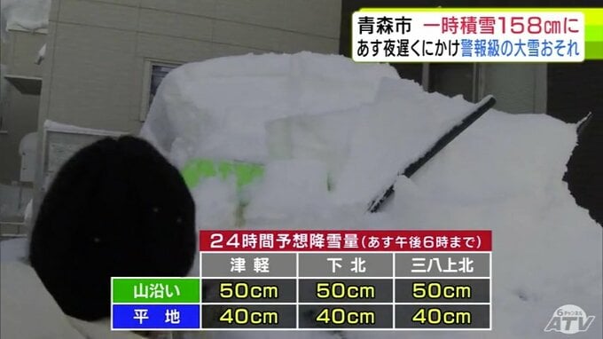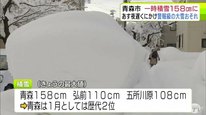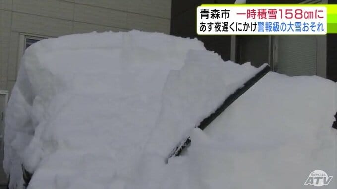 【雪の予想・29日午後9時50分現在】1月では「歴代2位」積雪が一時158cmに達した青森市 30日夜遅くにかけ「警報級の大雪」の恐れ 市民からは「諦め」と「悲鳴」に近い声 大雪シミュレーションあり 2026年1月29日(木) 21:51 国内 ♦大雪などの予想シミュレーションを見る (29~30日、31日、2月1日、2日、3日~4日) ♦この記事を最初から読む