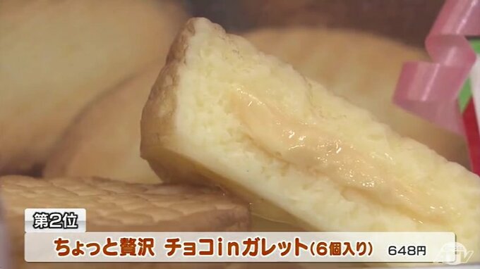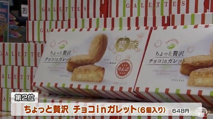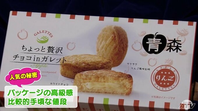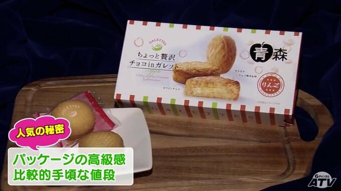 リンゴ風味のガレットでホワイトチョコをサンドしました。こちらは、パッケージに「高級感」を持たせて若い世代や女性をターゲットにしたそうですが、648円という比較的手頃な値段から修学旅行生にも人気があるそうです。