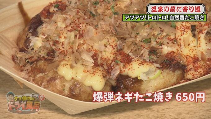 新井アナは【爆弾ネギたこ焼き】を注文。たこ焼きの上に、一味唐辛子とネギがたっぷりのっています。