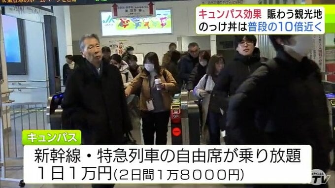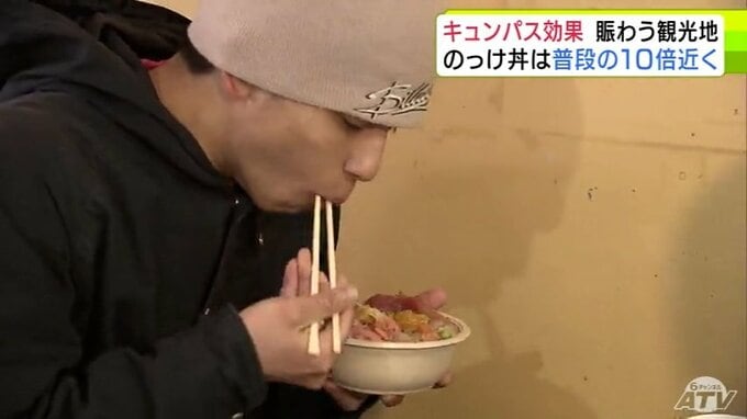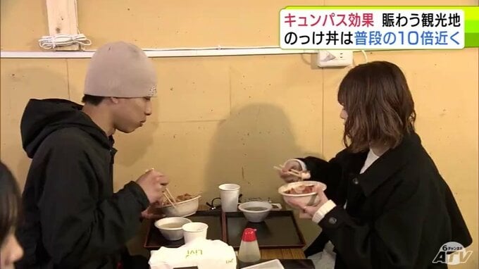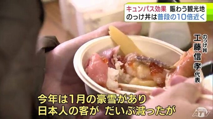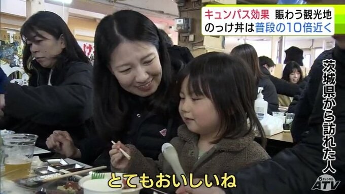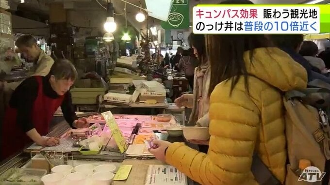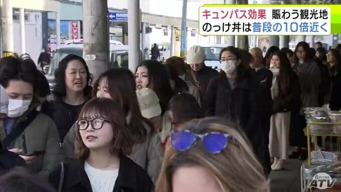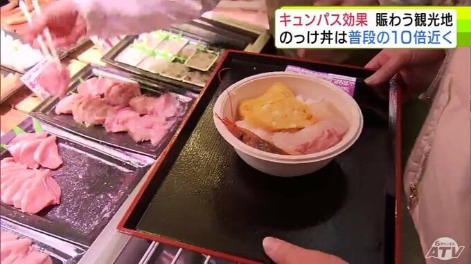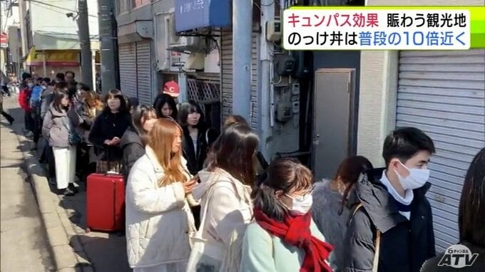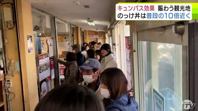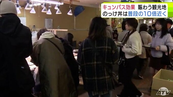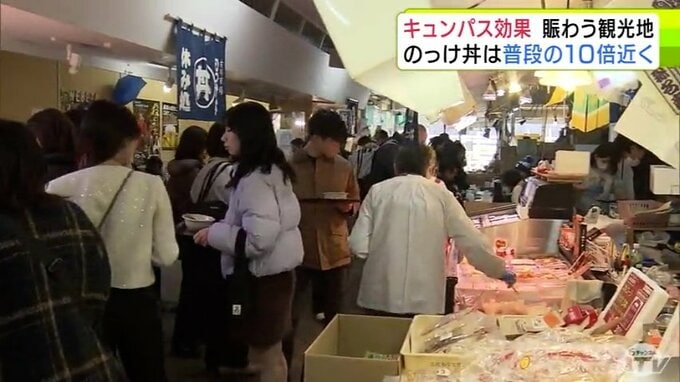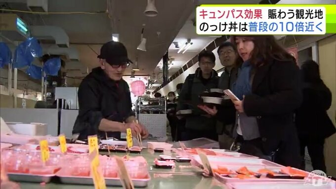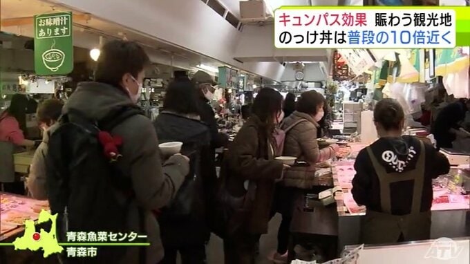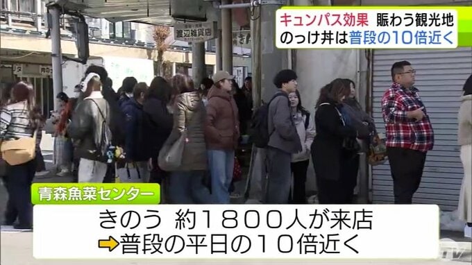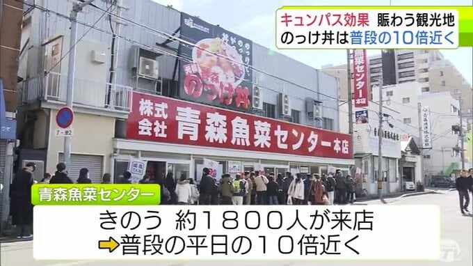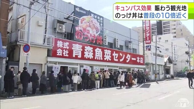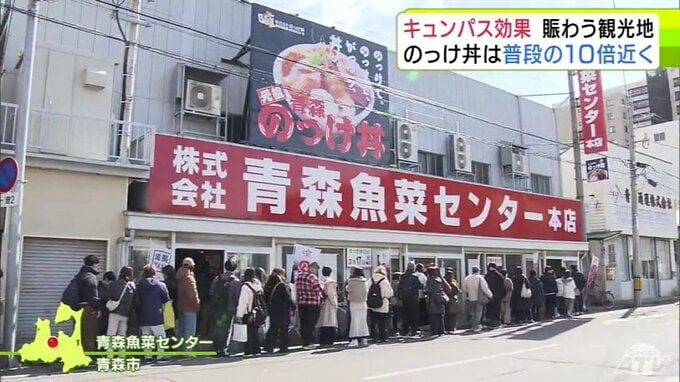 “キュンパス効果”で青森市の名物「のっけ丼」提供の青森魚菜センターに長蛇の列 11日の客数は約1800人で普段の平日の10倍近くに 観光施設に賑わい「1月に客が少なかった分を取り戻している感じ」 2026年3月12日(木) 21:27 国内 【写真を見る】青森魚菜センターに長蛇の列 ※「NEWS DIG」のアプリやサイト以外でご覧の方は、関連リンクから画像をご確認いただけます。