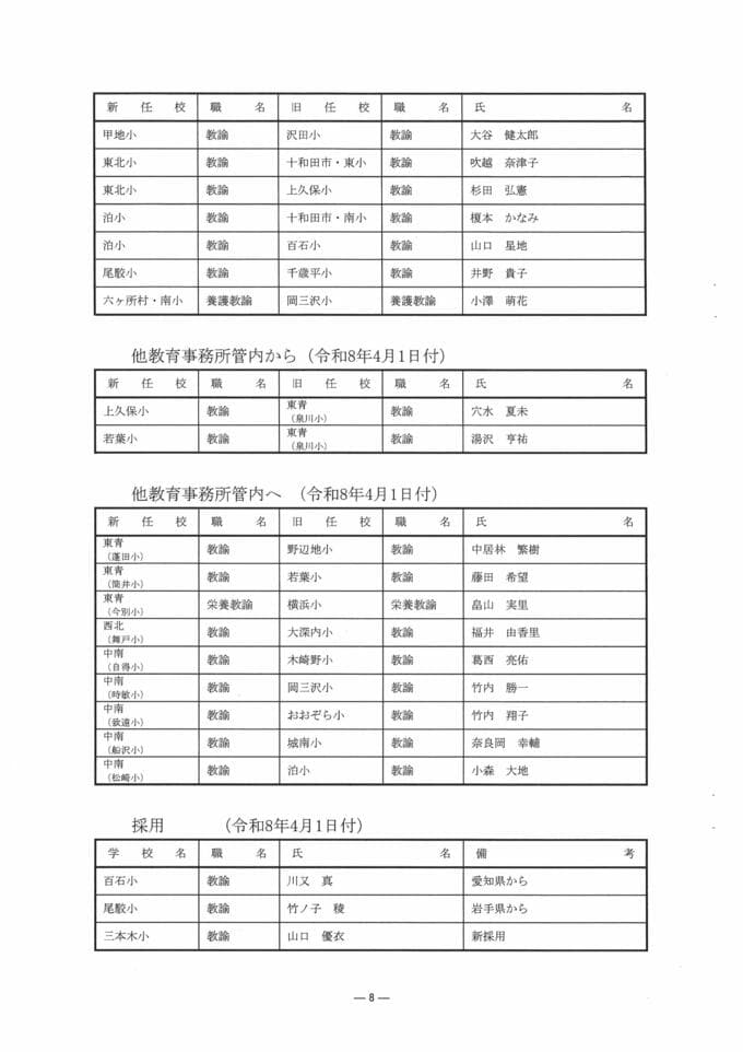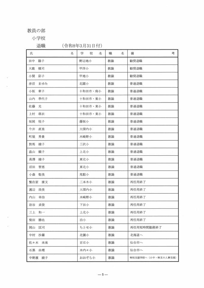 ATVの注目記事まとめ! 青森県教職員人事異動2026 「あの先生どこに行ったんだべ?」 小学校・中学校(上北管内) 一覧【名簿全掲載】 2026年3月18日(水) 17:00 国内 青森県 教職員人事異動一覧2026 【小学校・中学校(上北管内)】教員の部① 【記事を最初から読む】