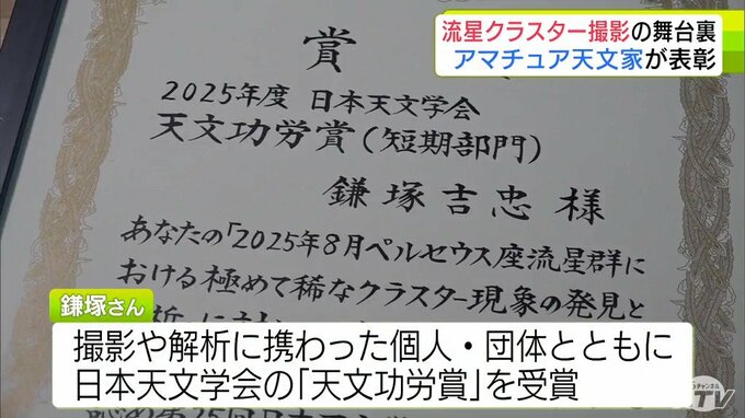 鎌塚さんは、ペルセウス座流星群の流星クラスターという歴史的な天文現象の撮影や解析の功績を評価され、ほかの団体や愛好家とともに日本天文学会から「天文功労賞」を贈られました。
