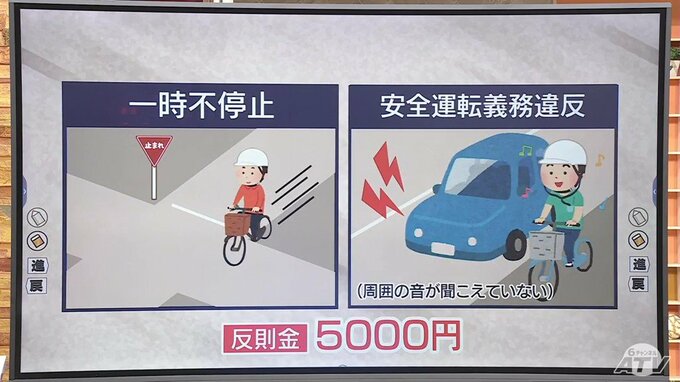 このほか、反則金5000円の反則行為については、「一時不停止」や「イヤホンなどをして周囲の音が聞こえない状態での運転などといった安全運転義務違反」があります。