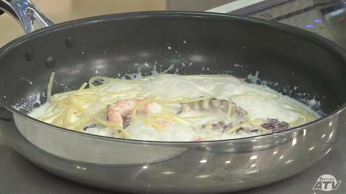 3.フライパンに、パスタのゆで汁・生クリーム・牛乳・チキンコンソメ・シャコ・サラダエビを入れ火にかける。