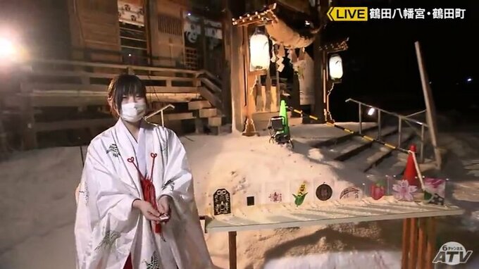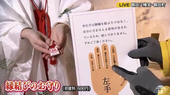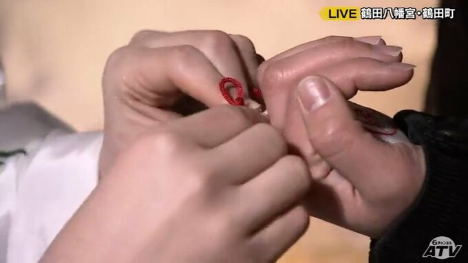 鶴田八幡宮の境内には、親子が身を寄せ合っているように見える石が祀られ、これをなでると良い縁があるということで「縁結びの神社」とも言われています。この時期は石が雪に覆われてしまいますが、年末年始の特別な期間だけやっているということです。そして毎月その石を磨く日にだけある特別なお守りがあります。見た目はシンプルなお守りですが、巫女さんが参拝客の指にお守りを結んでくれます。どの指に結んでもらうかによって意味が異なり、鶴田八幡宮によると親指は夢との糸、人差し指は人生転機の糸、中指は親友や家族との糸、薬指は愛する人との糸、小指は出会いの糸ということです。