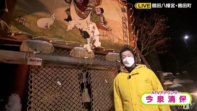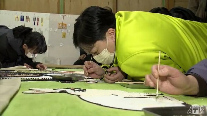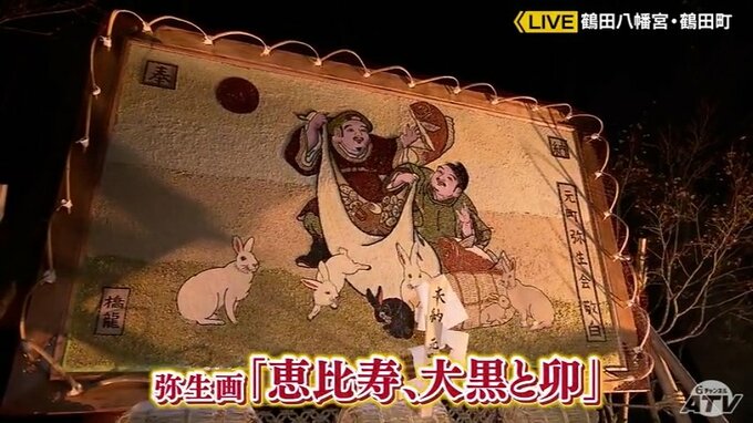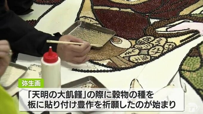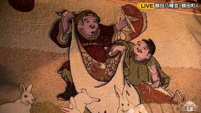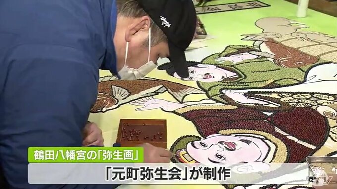 青森県鶴田町にある鶴田八幡宮。訪れて、まず目を引くのは鳥居に飾られている「弥生画」と呼ばれる穀物の種を使って制作した絵です。2023年の題材は「恵比寿、大黒(だいこく)と卯」。縦約2メートル横3メートルの板の上に、小豆(あずき)や米など17種類の穀物の種で描かれました。「鶴田八幡宮」は、この「弥生画」が毎年奉納されることで知られています。