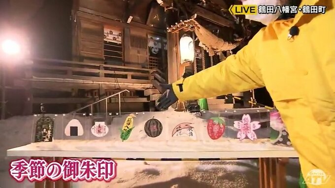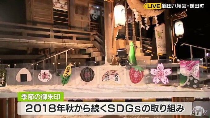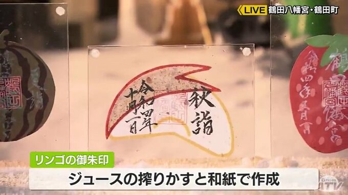 鶴田八幡宮は「弥生画」のほかにもこちらにしかない「季節の御朱印」と珍しい「お守り」もあり、青森県外からも注目されています。その「御朱印」を見てみると、嶽きみやスイカに、リンゴなどどれも青森県産品の形をしています。加工した際に出る廃棄物を再利用していて、たとえばリンゴだとジュースを絞ったあとのクズを和紙と混ぜてこのような御朱印にしています。持続可能な開発のための17の国際目標「SDGs」に賛同して2018年の秋から続けているそうです。