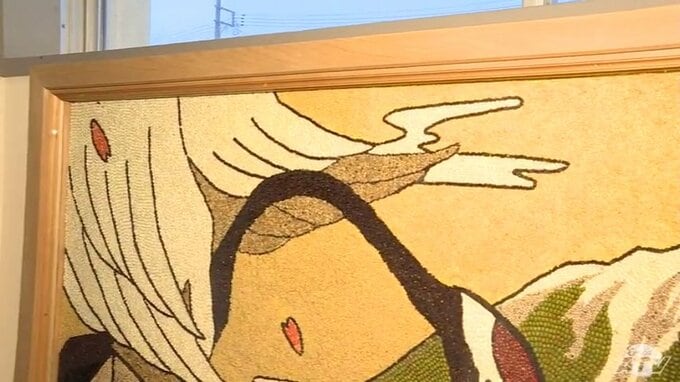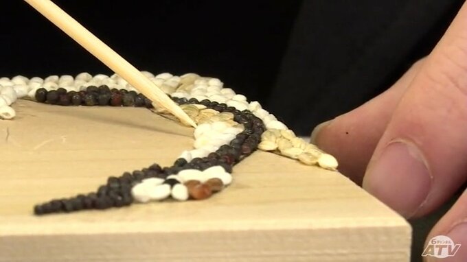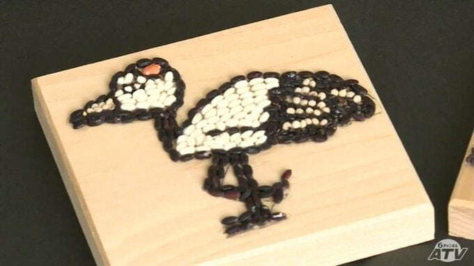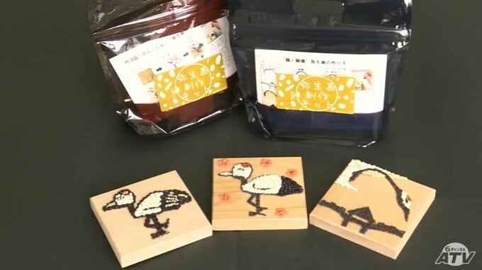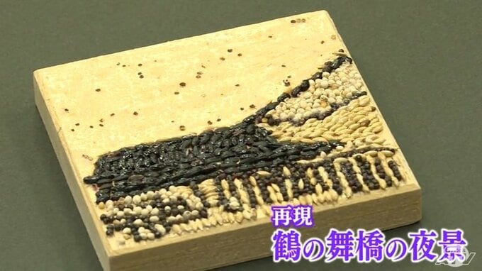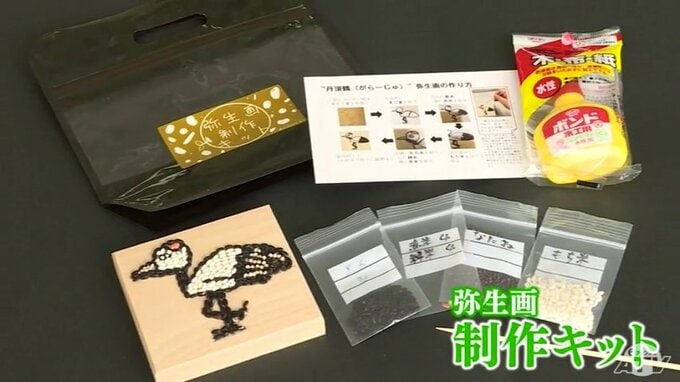 それが、江戸時代から鶴田町に伝わる弥生画(やよいが)の制作キットの開発です。袋詰めした穀物の種を1粒ずつ板に貼り付けると町のシンボル、タンチョウヅルと鶴の舞橋が浮かび上がってきます。