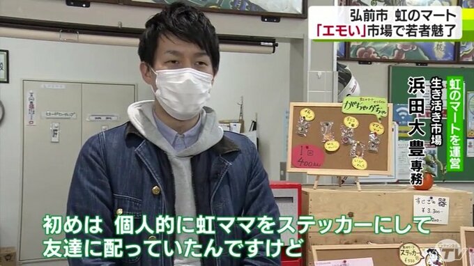 「はじめは僕が個人的に虹ママのキャラクターをステッカーにして友達に配っていたんですけど特に20代の方々から『一周回ってすごくこのキャラクターエモいね』と言われ反応が良かったのでグッズ化したら面白いかな」