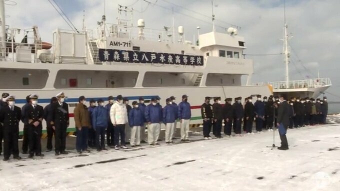 引退セレモニーでは、海洋生産科の松井李玖都(まついりくと)さんが挨拶したあと、冨田秀一船長が青森丸へ花束を贈り、これまでの功労に感謝の思いを伝えました。