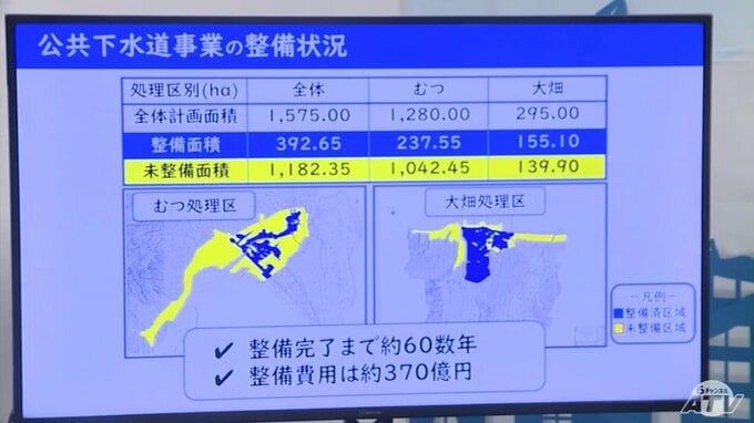 「赤字拡大より事業に見切り」 むつ市が下水道整備を新年度休止 2023年2月1日(水) 19:03 国内 むつ市は新年度、下水道の整備を休止すると発表しました。今後は、浄化槽を設置するさいの補助を拡充することを検討するとしています。むつ市の宮下宗一郎市長は、1日の定例会見で新年度の当初予算案に下水道の整…