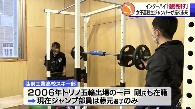 高校世代の頂点を決めるインターハイを控えた今月2日、藤元彩子選手の姿は弘前工業高校にありました。高校生が学校で練習するのは当たり前に思うかも知れませんが、彼女が取り組んでいるのは…ジャンプスキーのジャンプ競技です。