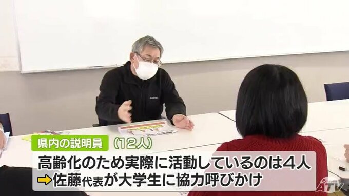 説明員は献血会場で登録会を開催し、骨髄移植までの流れを説明して登録手続きを行うボランティアです。青森県内には、12人の説明員がいますが、高齢化して実際に活動しているのは4人にとどまり、佐藤代表は大学生に協力を呼びかけています。